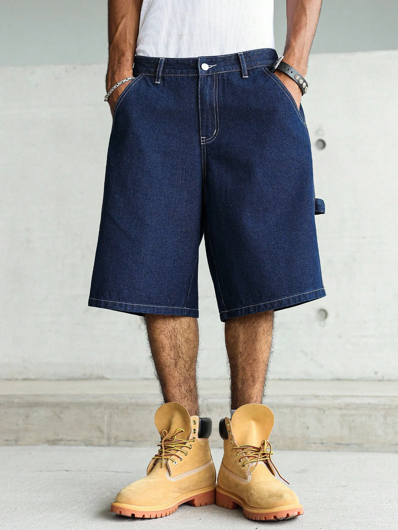 Men's Dark Blue Wide-Leg Denim Shorts These shorts feature a structured and roomy fit that flatters various body types, delivering an unrestrictive wearing experience while exuding a casual and uninhibited trendy vibe. Their color tone is versatile and enhances a sense of quality.