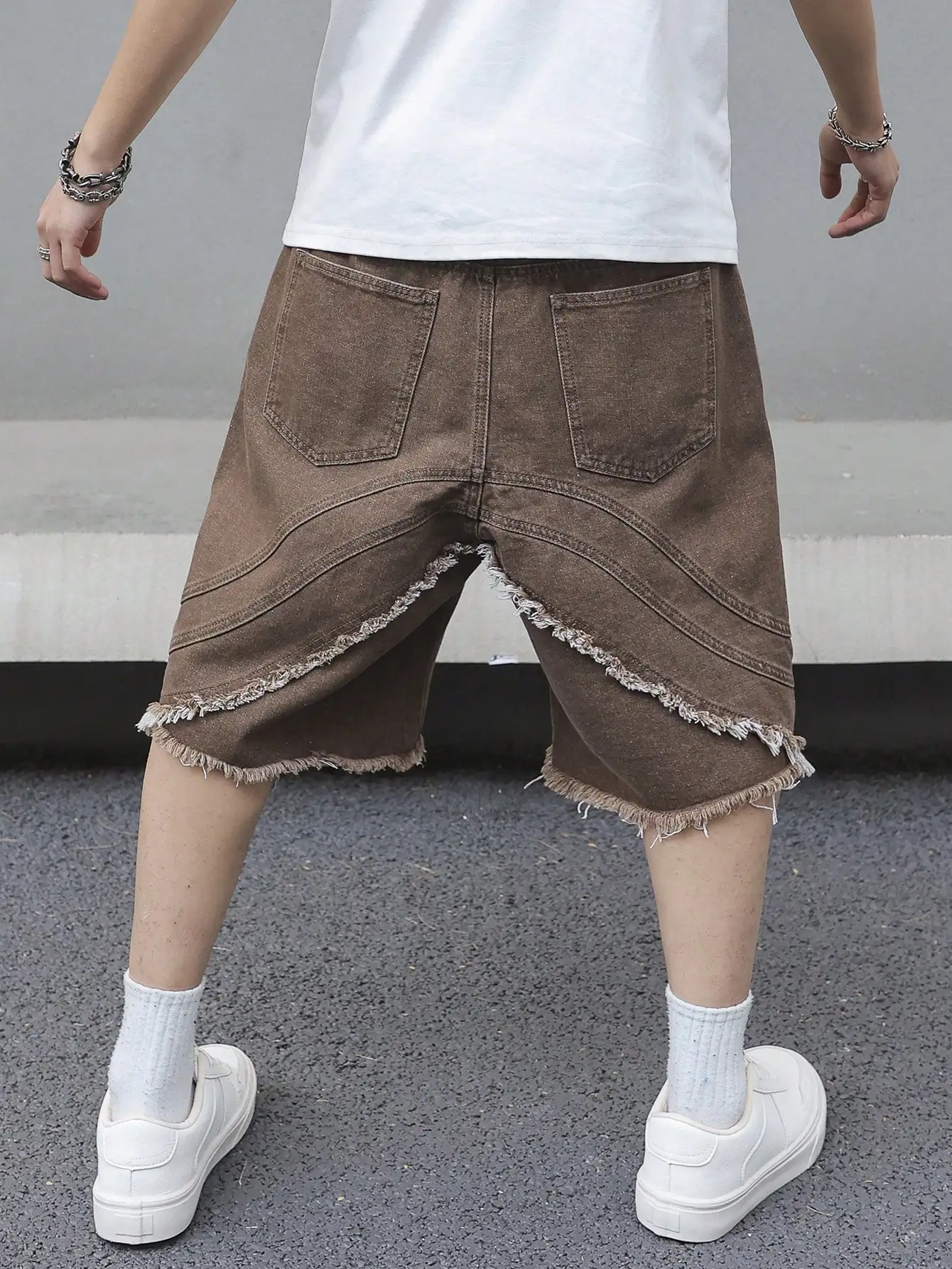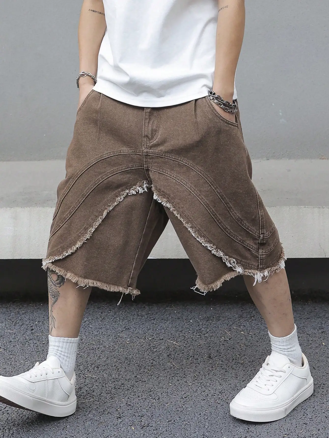 Brown Frayed Denim Wide-Leg Shorts in Street Style